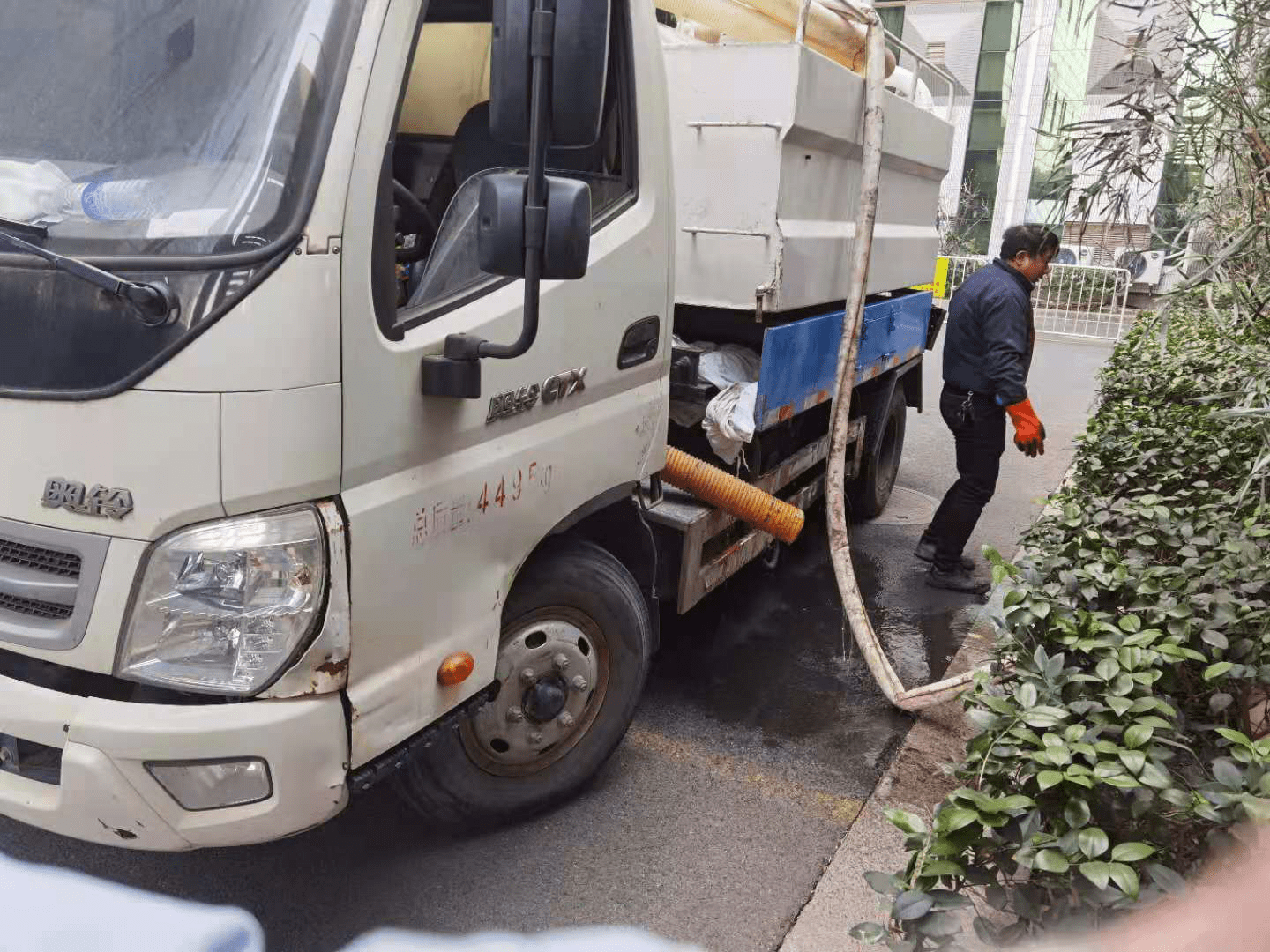 3、利用工具挖去隔油池表面凝固油垢,或启动吸污车吸出油池内污水到化油结块物吸完为止;